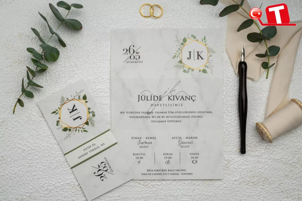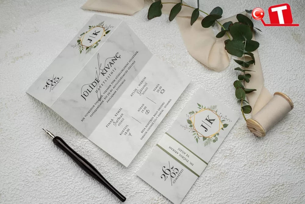 -Davetiyeler, görselde göründüğü şekildedir. Zarflı modeller için zarf bedeli fiyata dâhildir. Ancak, bazı davetiye modellerinde zarf bulunmamaktadır. Baskı yapılan alan katlama vb. işlemler sayesinde zarf görevi de görmektedir.