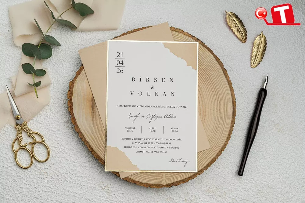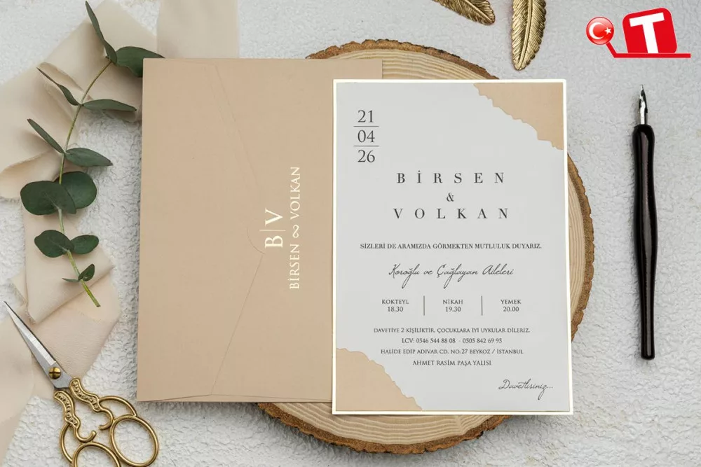 -Davetiyeler, görselde göründüğü şekildedir. Zarflı modeller için zarf bedeli fiyata dâhildir. Ancak, bazı davetiye modellerinde zarf bulunmamaktadır. Baskı yapılan alan katlama vb. işlemler sayesinde zarf görevi de görmektedir.