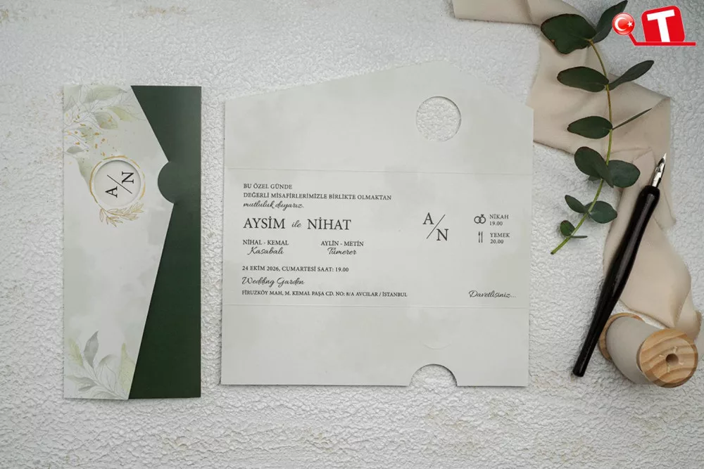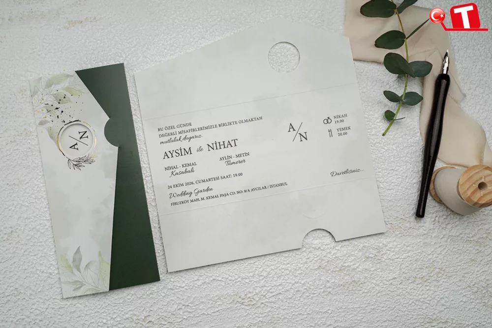 -Davetiyeler, görselde göründüğü şekildedir. Zarflı modeller için zarf bedeli fiyata dâhildir. Ancak, bazı davetiye modellerinde zarf bulunmamaktadır. Baskı yapılan alan katlama vb. işlemler sayesinde zarf görevi de görmektedir.