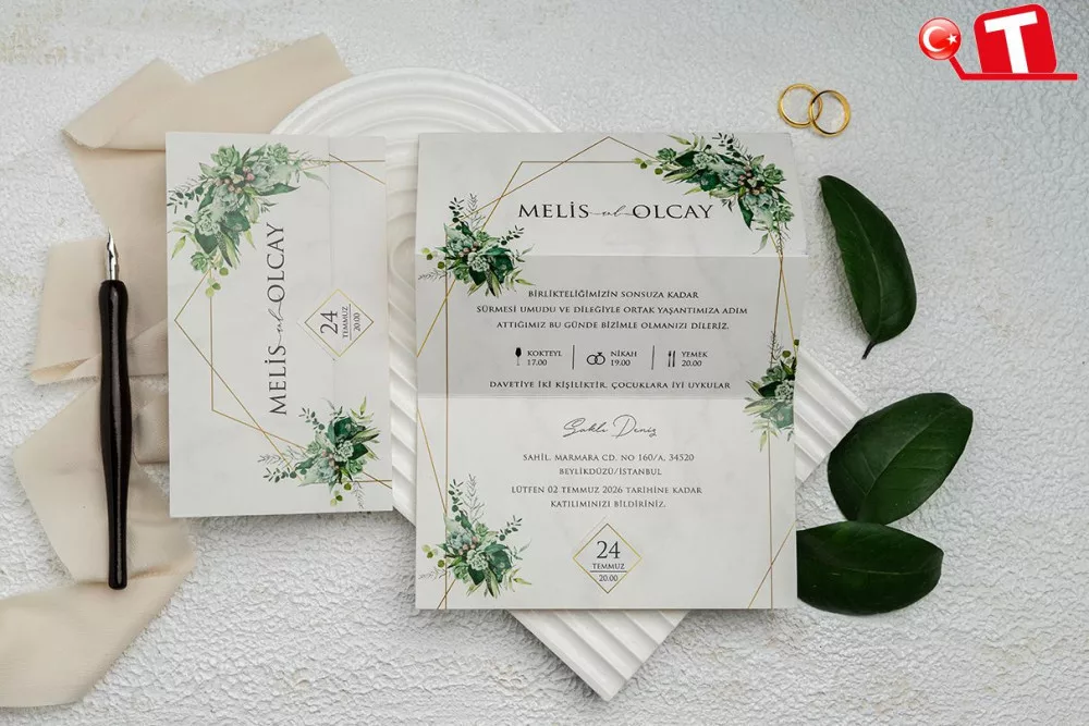 -Davetiyeler, görselde göründüğü şekildedir. Zarflı modeller için zarf bedeli fiyata dâhildir. Ancak, bazı davetiye modellerinde zarf bulunmamaktadır. Baskı yapılan alan katlama vb. işlemler sayesinde zarf görevi de görmektedir.