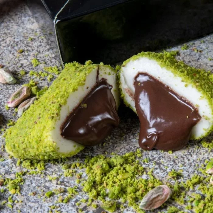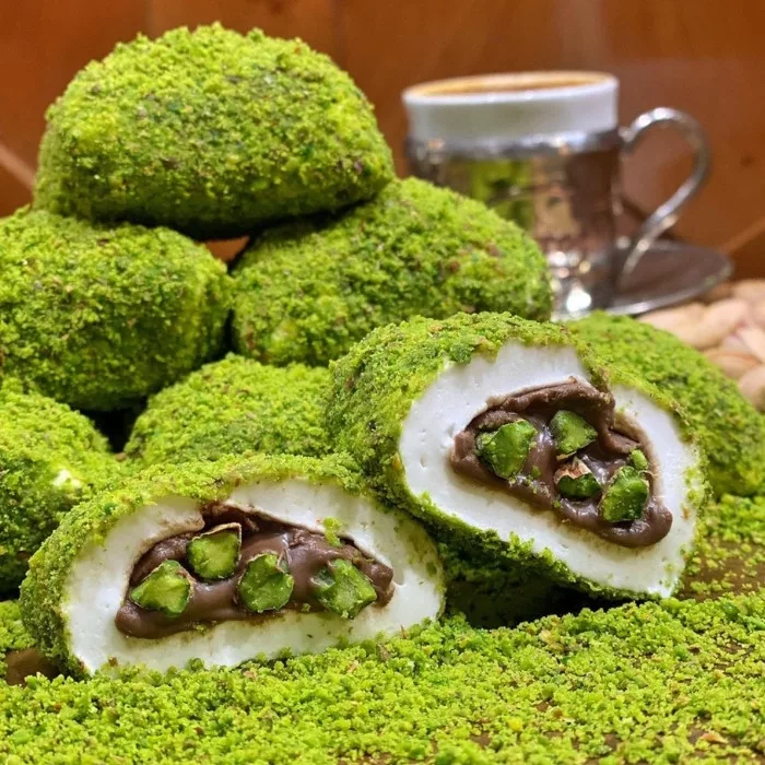 Dışı Antep fıstıklı, içi çikolata dolgulu Antep-Bohça, geleneksel Türk tatlı ustalığını modern bir lezzetle buluşturur. İnce açılmış hamur katmanı, dış kısmında bolca serpilmiş Antep fıstığı ile kaplanır ve her lokmada belirgin bir fıstık aroması sunar. İç kısmındaki yumuşak çikolata dolgusu ise ağızda nazikçe eriyerek dengeli bir tatlılık sağlar.