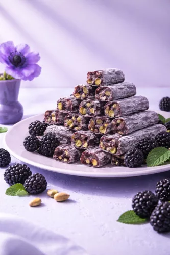 Yoğun aromalı siyah dut ve çıtır Antep fıstığı ile hazırlanan nefis Docht lokum. Yumuşak, sulu dokusu ve bol iç dolgusu ile çay, kahve ikramları ve şık hediye sunumları için ideal.